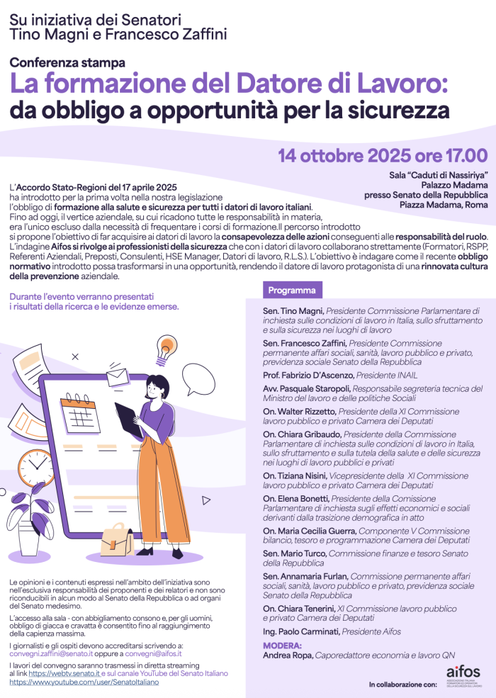 Con orgoglio ed emozione ho partecipato come Consigliere nazionale AiFOS Associazione Italiana Formatori ed Operatori della Sicurezza sul lavoro all’iniziativa organizzata dal Senato della Repubblica per la condivisione del nostro rapporto AiFOS 2025 dedicato a “La formazione del Datore di Lavoro: da obbligo a opportunità” illustrato efficacemente dal Presidente Paolo Carminati alla presenza anche del Direttore Generale Maria Frassine.