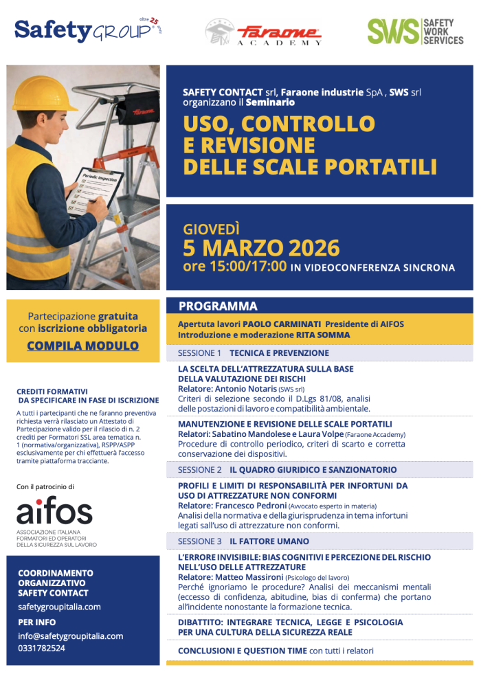 In questo seminario, con la guida di esperti di settore, parleremo di scelta dell’attrezzatura in base alla valutazione dei rischi, manutenzione revisione delle scale portatili, responsabilità per infortunio da uso di attrezzature non conformi e bias cognitivi e percezione del rischio nell’uso delle attrezzature stesse.